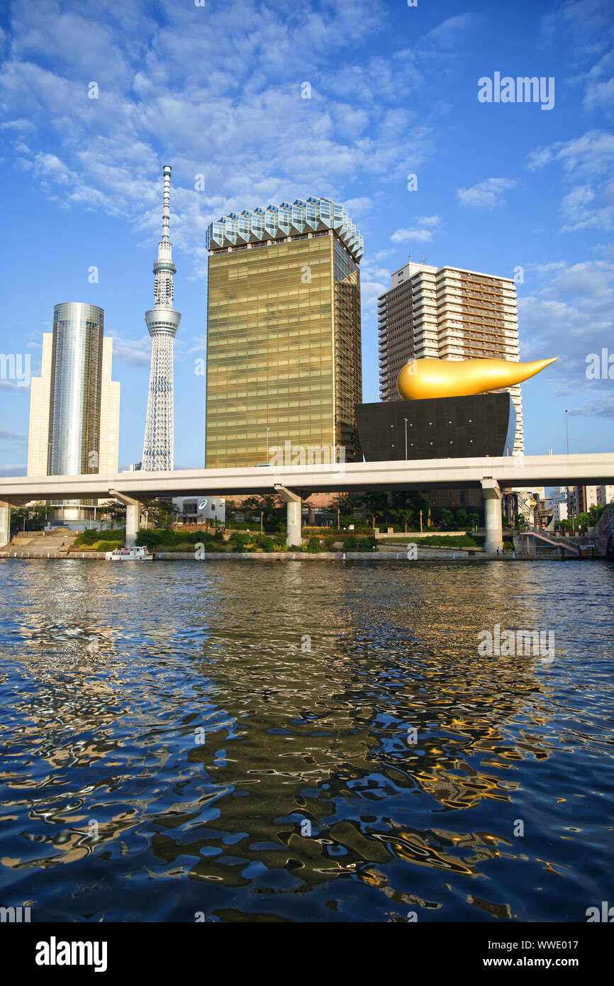 File Asahi Breweries Headquarters Building With The Asahi Flame And Skytree At Blue Hour With Full Moon Sumida Ku Tokyo Japan Jpg Wikipedia