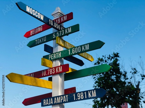 Wooden Colorful Sign Post Indicating Drectional Arrows And Distance In Kilometers To Moscow Beijing Tokyo Perth Raja Ampat In Nusa Dua Bali Buy This Stock Photo And Explore Similar Images At