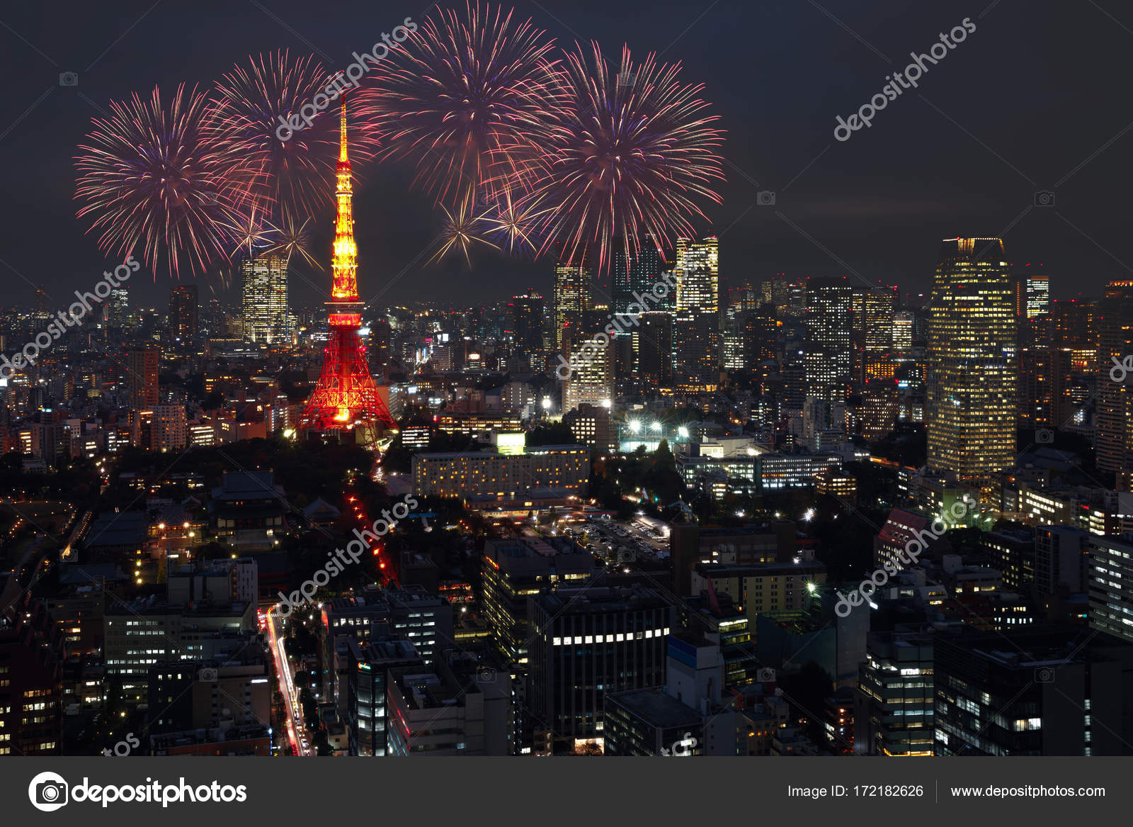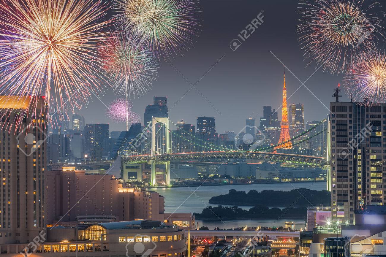 Amazing Panoramic View To City Centre Of Tokyo With Fireworks In The Evening Tokyo Tower At Night Stock Photo Download Image Now Istock