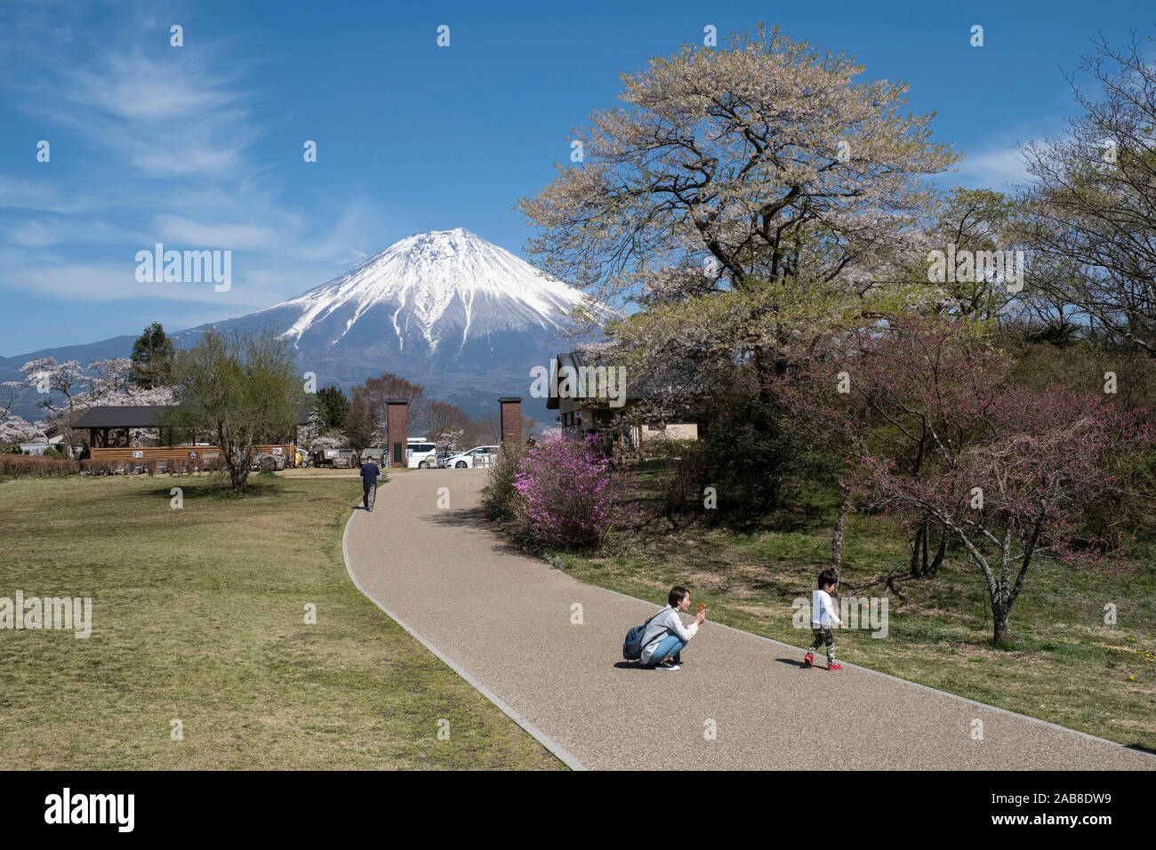 Japan Fujinomiya Shizuoka Prefecture Mount Fuji With Its Snow Covered Summit And Japanese Woman Taking A Picture Of Her Son With A Smartphone In Fr Stock Photo Alamy