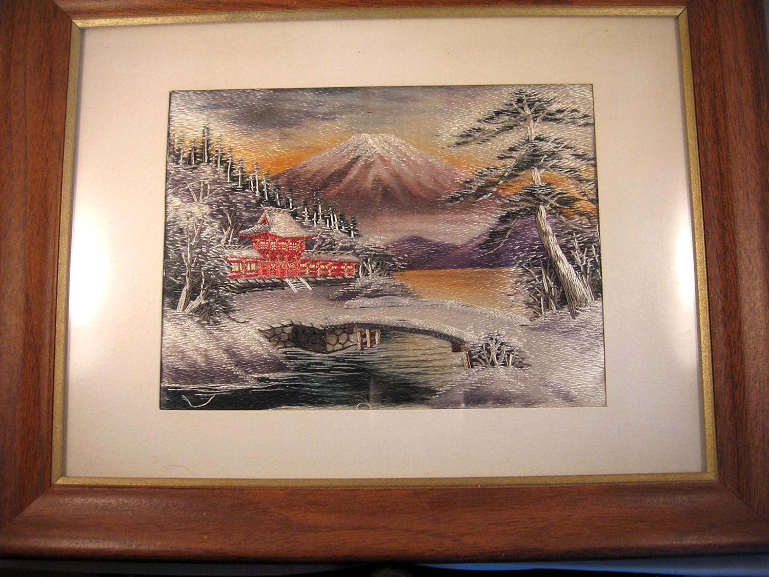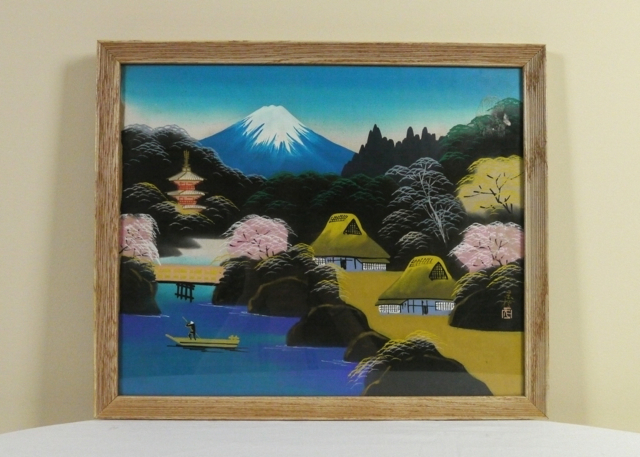 I have a framed behind glass silk tapestry of a japanese scene mt fuji in the background that i know is at least 75 years old. Please view all photos for overall condition. View it on ebay.