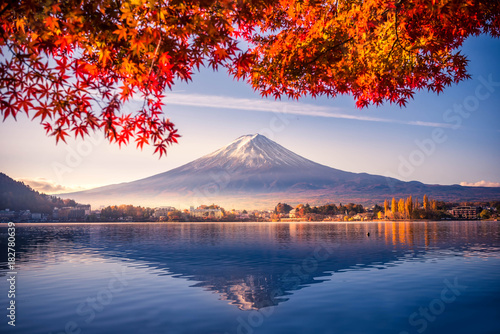 Canvas Prints Colorful Autumn Season And Mountain Fuji With Morning Fog And Red Leaves At Lake Kawaguchiko Is One Of The Best Places In Japan Nikkel Art