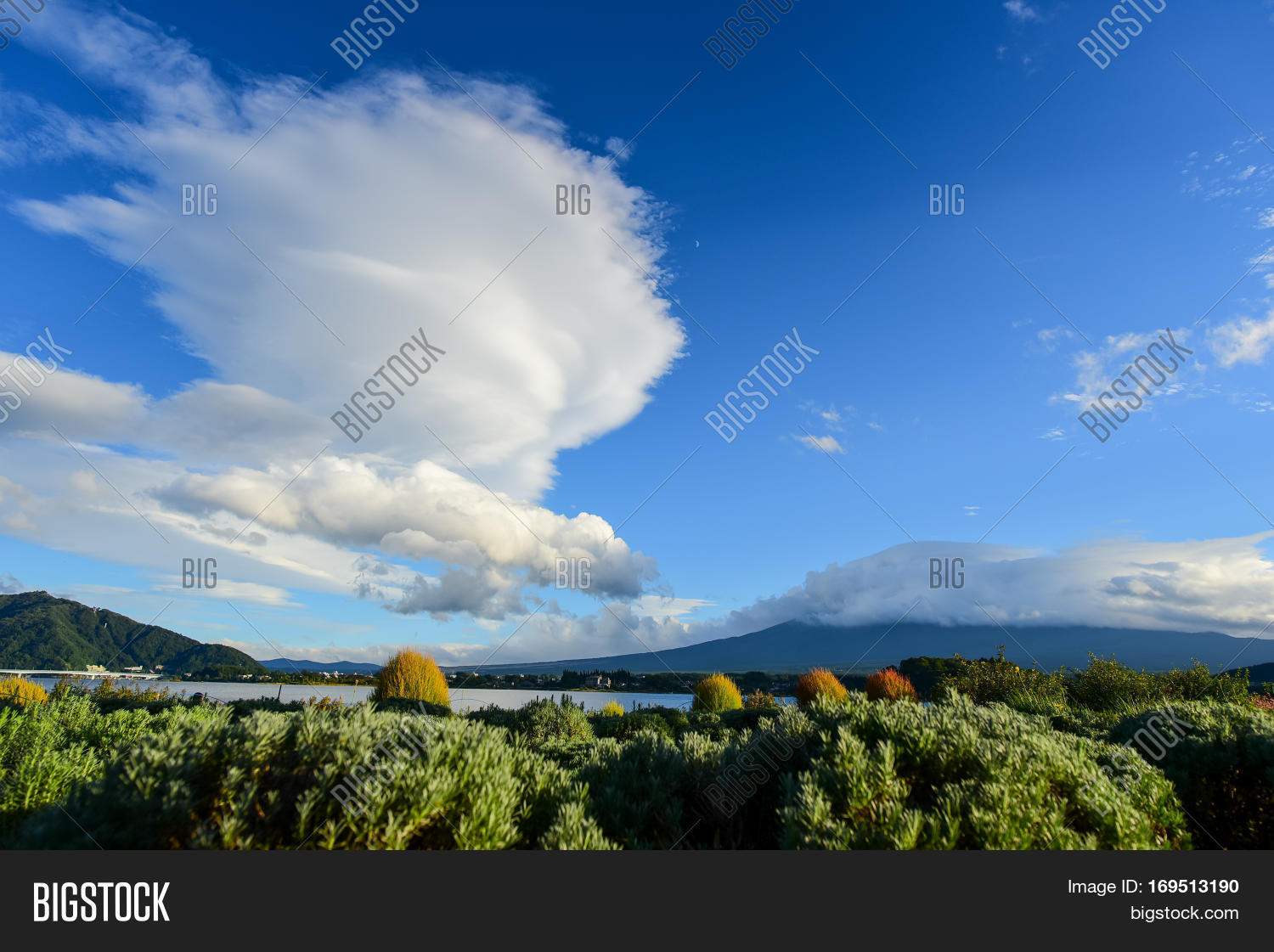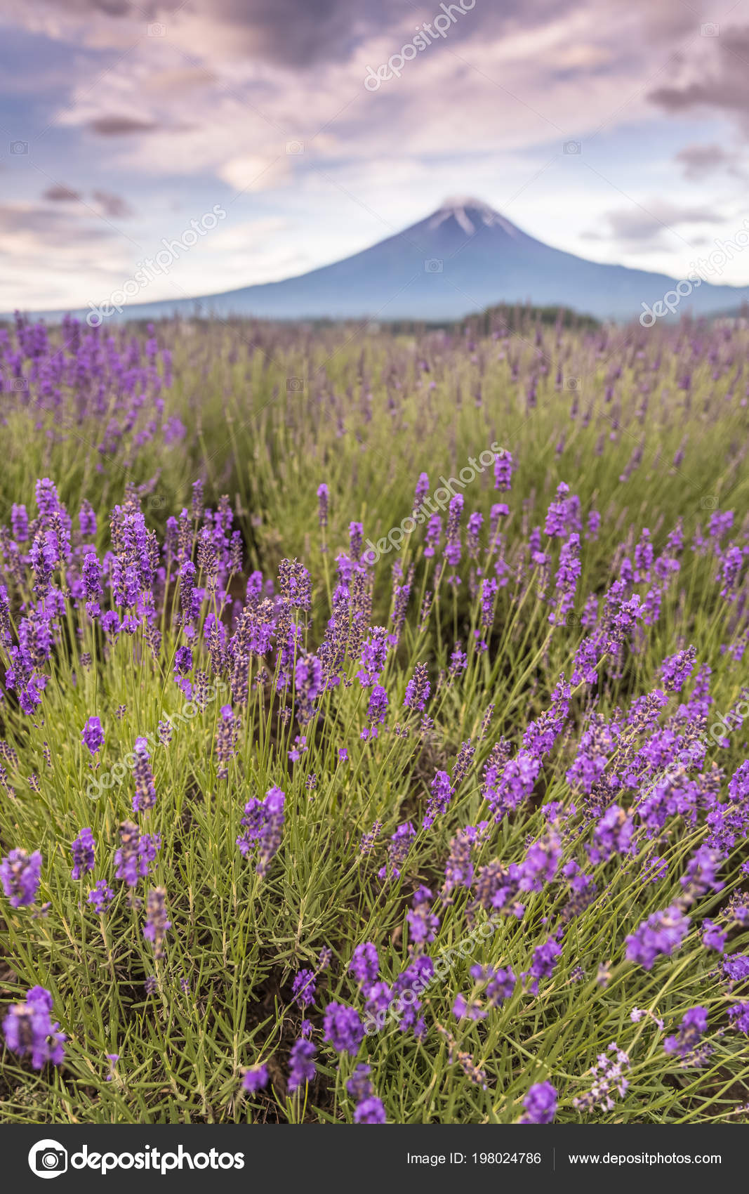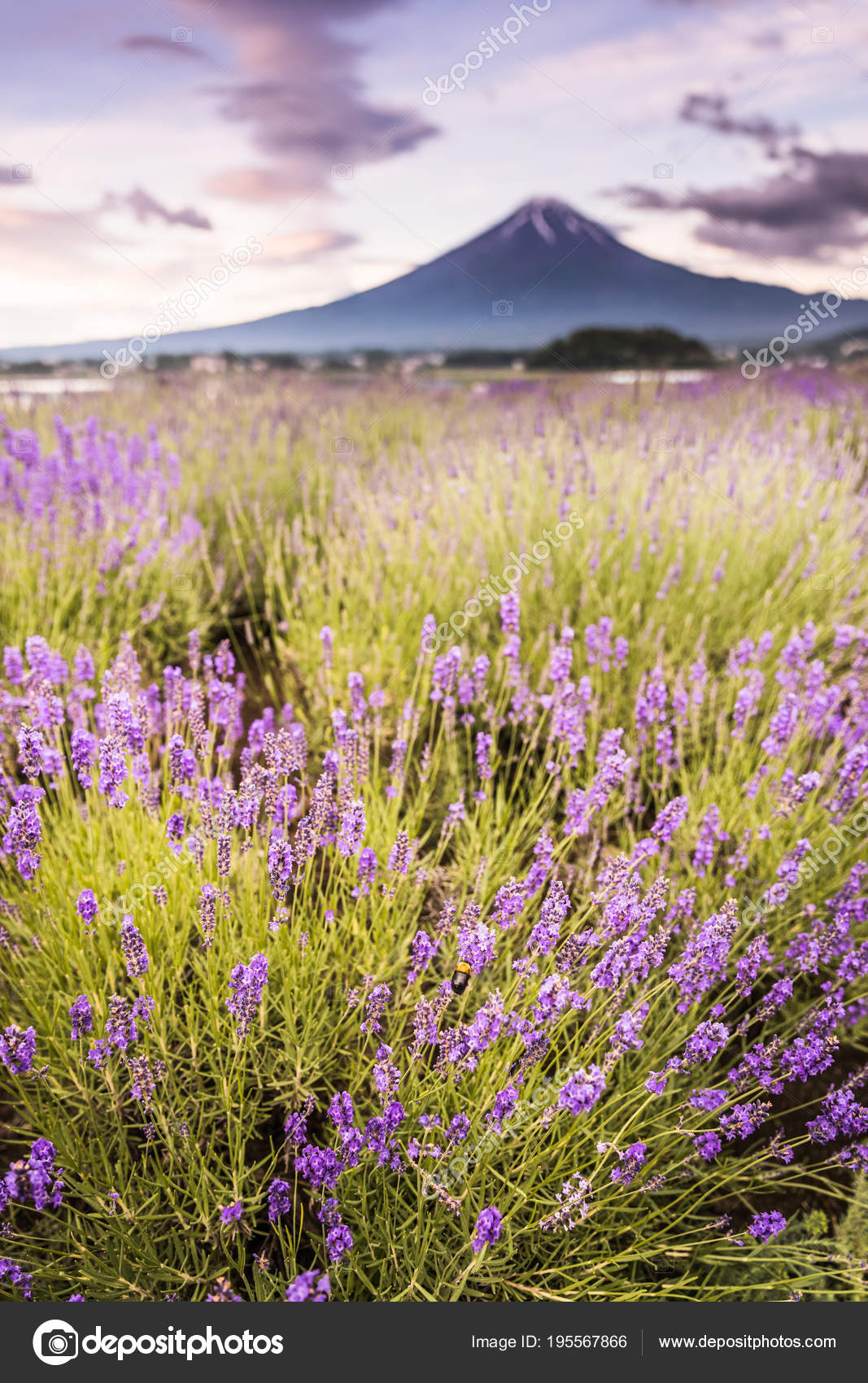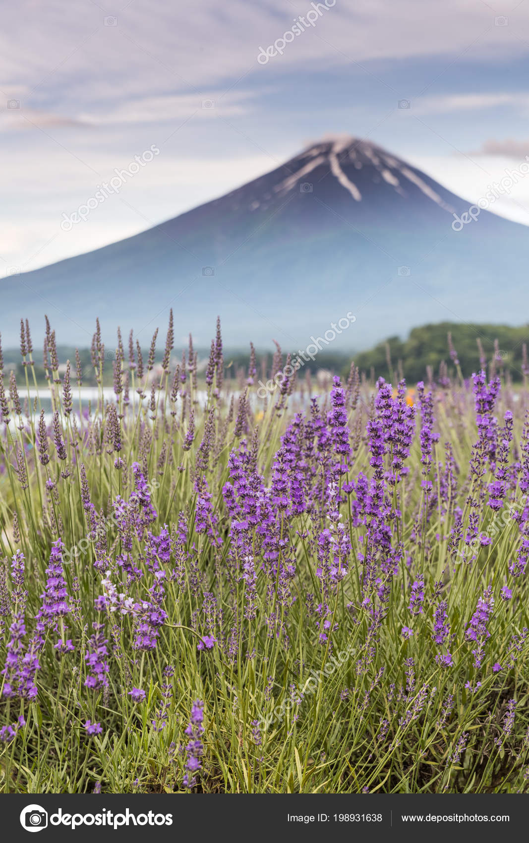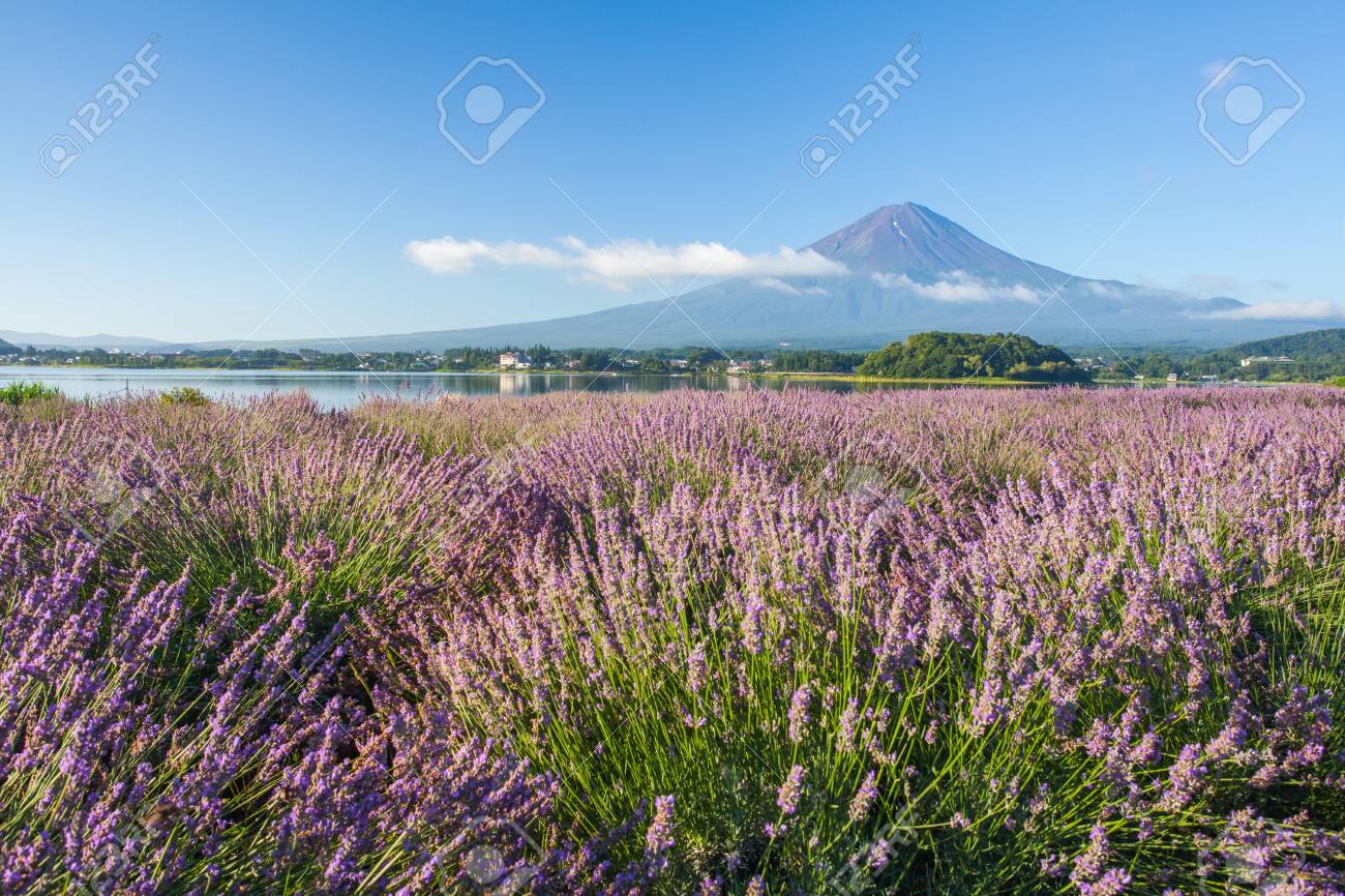 View Of Mountain Fuji And Lavender Fields In Summer At Lake Kawaguchiko Stock Image Image Of Environment Morning 123786797