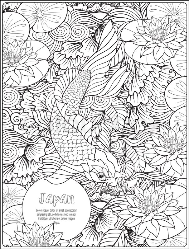 Japanese Landscape With Mount Fuji And Tradition Flowers And A Bird Outline Drawing Coloring Page Coloring Boo Coloring Pages Outline Drawings Coloring Books