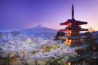 Fujiyoshida Japan With Mt Fuji And Chureito Pagoda At Dusk During Spring Cherry Blossom Season Stock Photo Alamy