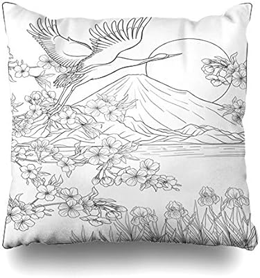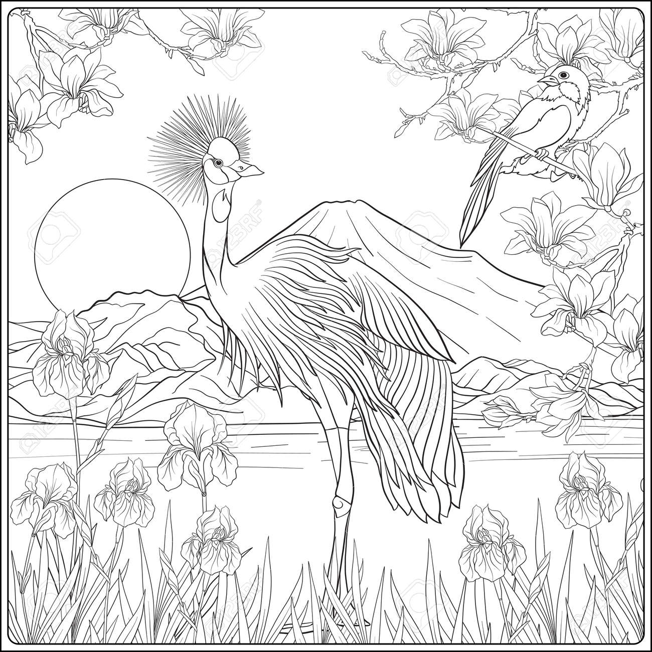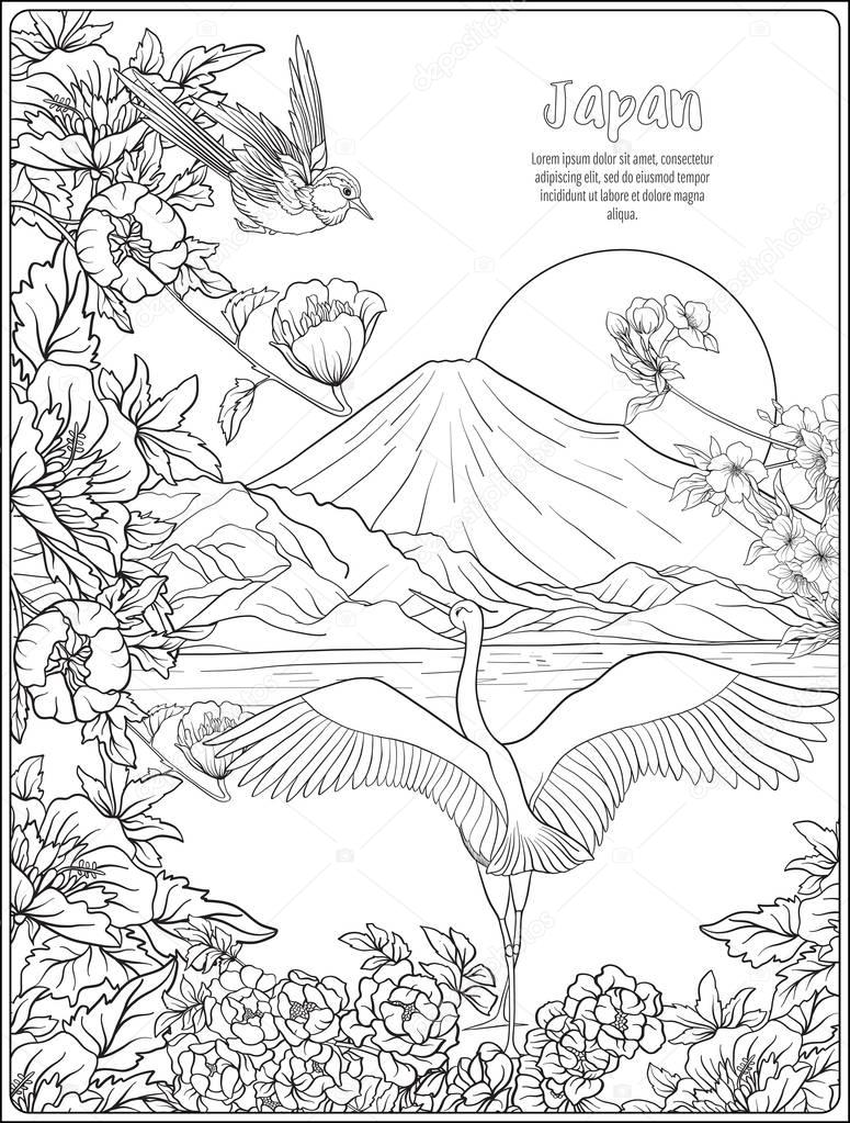Japanese Landscape With Mount Fuji And Tradition Flowers And A B Stock Vector Illustration Of Crane Bird 101338426
