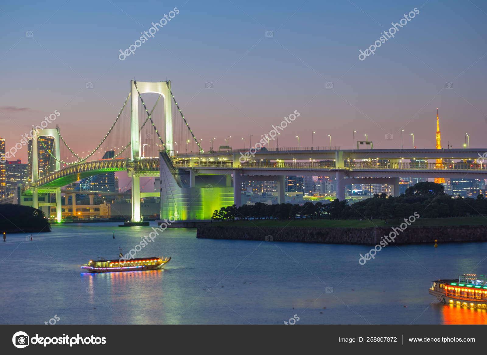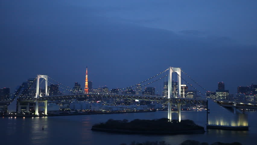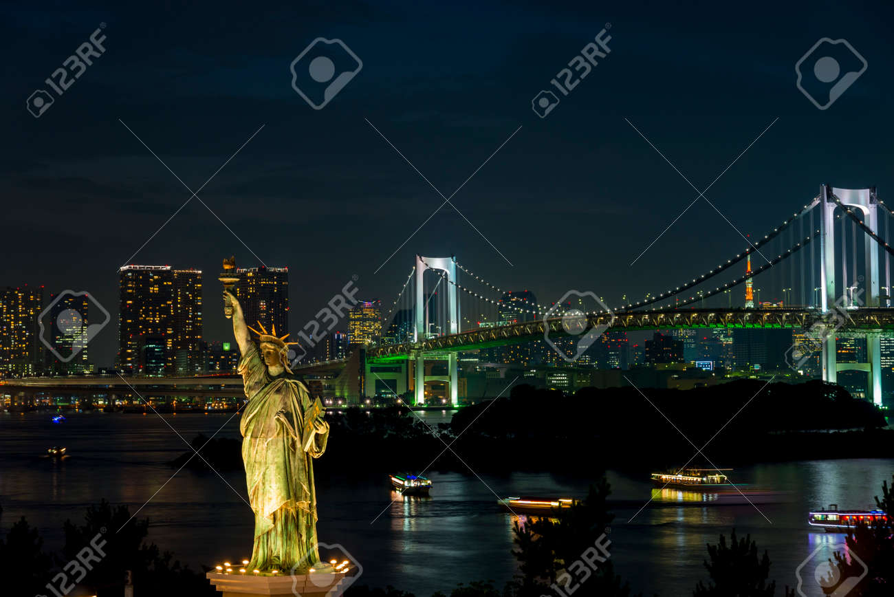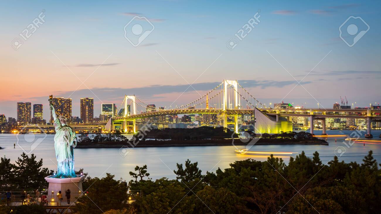 Asia Japan Tokyo Tokyo Bay Odaiba Rainbow Bridge Tokyo Tower And The Replica Statue Of Liberty Illuminated At Dusk By Gavin Hellier Stocksy United