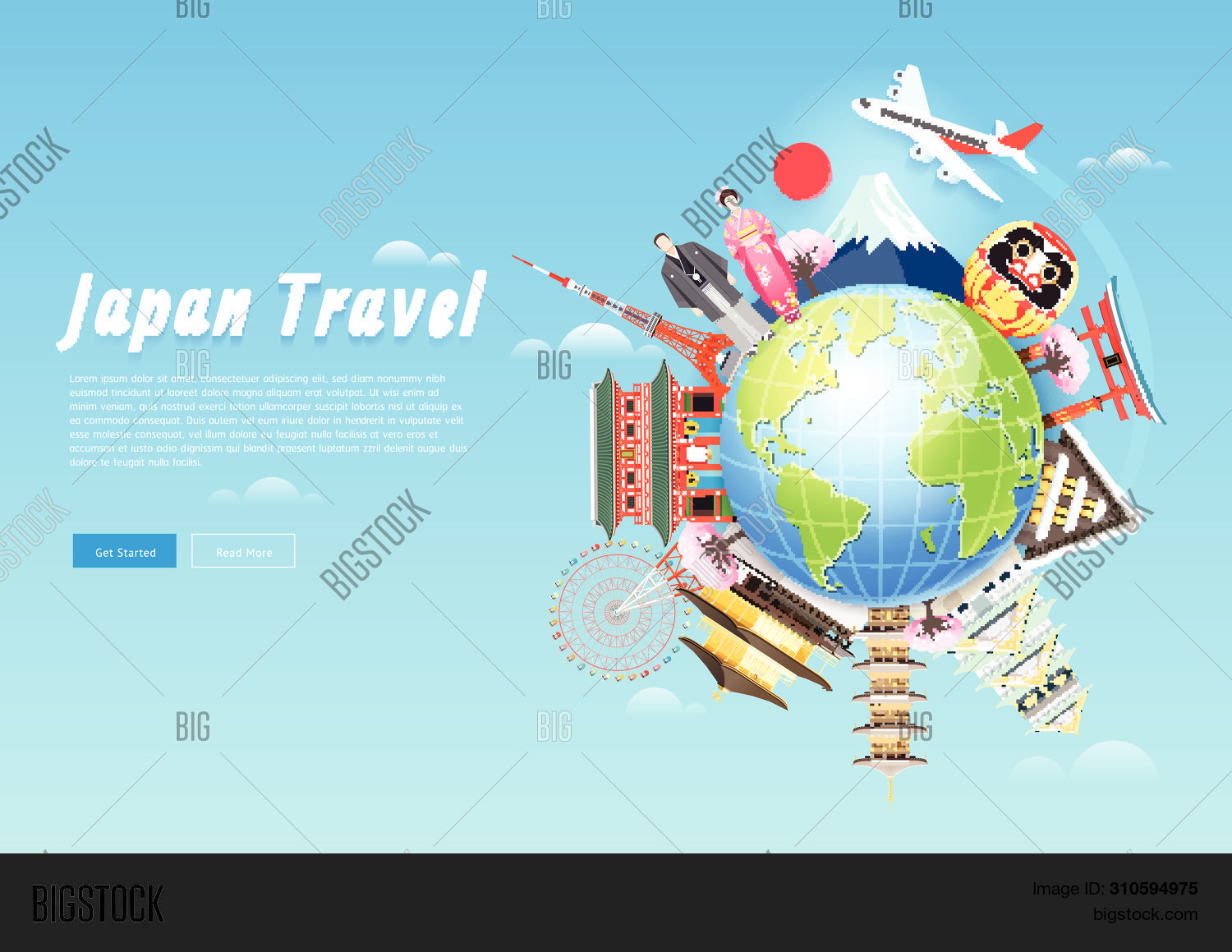 Japan Famous Landmarks Travel Map With Tokyo Tower Fuji Mountain Shrine Castle Great Buddha Temple Ferris Wheel Sakura Blossom And Flying Fish Flags Colorful Flat Style Background Buy This Stock Vector